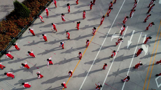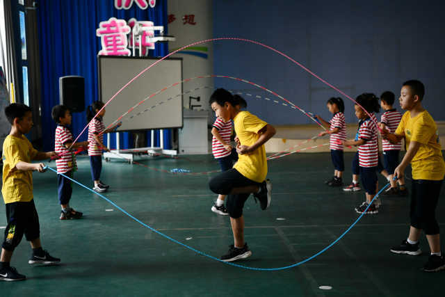 “哒哒哒……”,孩子们双腿交替,像高速运转的马达,脚尖像雨点一样密集地落在地板上,速度很快,似乎看不见绳子。