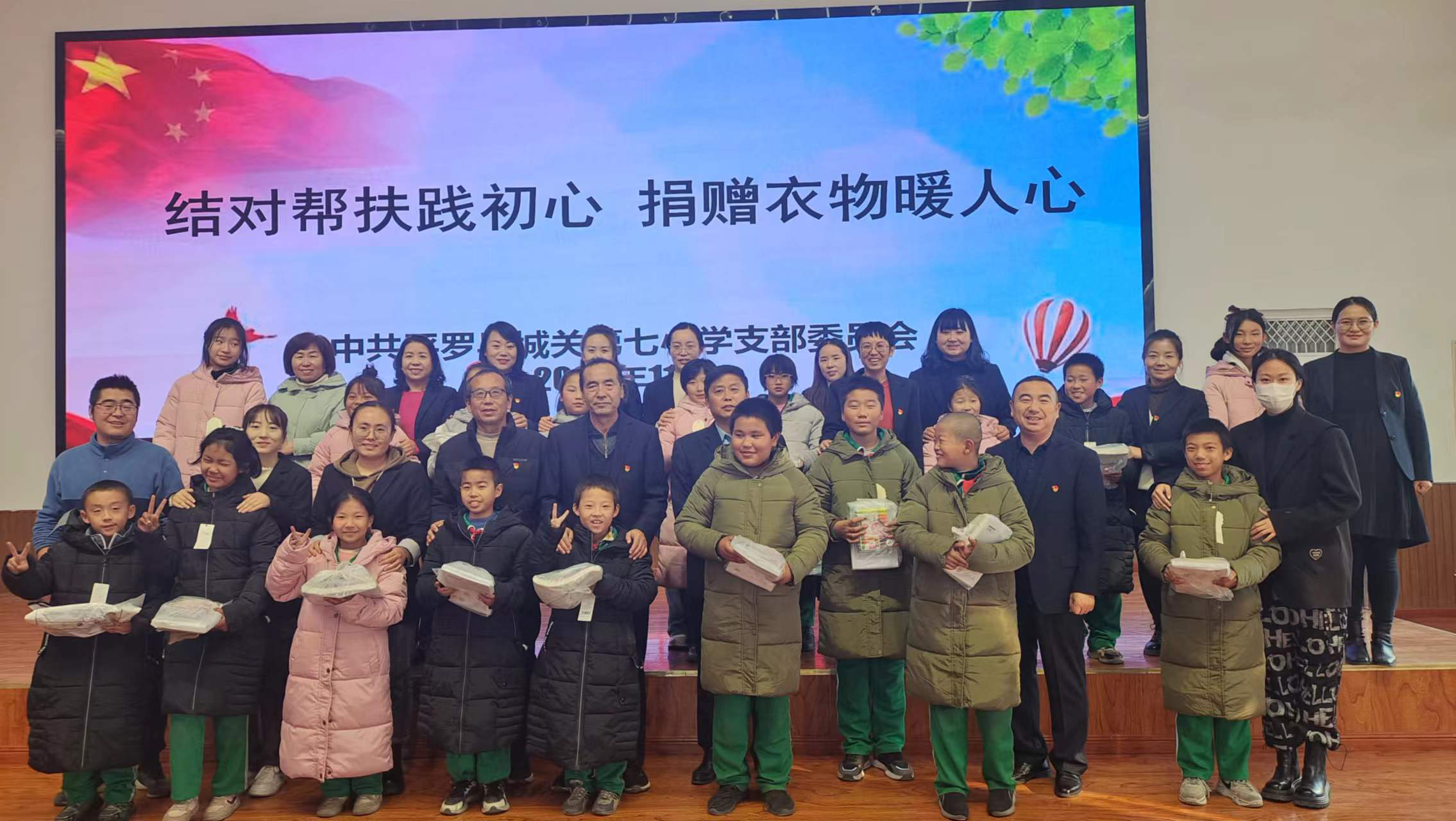 在创新活动环节,学校党支部结合主题教育总要求,组织开展了“结对帮扶践初心 捐赠衣物暖人心”爱心捐赠活动。18名党员教师为集中办学转入我校家庭困难的18名学生发放了由党支部积极协调、对接社会爱心企业和人士捐赠的学习用品和棉衣。