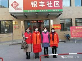 疫情就是命令,防控就是责任!大年初三,金凤区统一部署,要抽调部分教师下社区做志愿者服务工作,在魏茜校长的带领下,邓艳萍、马向丽、康海燕、马薇、岳欢欢等几位中层领导第一时间报名参加,蒯东萧、李永攀、彭芳、张芳琴、蔡华、王丽红、沈晓萍、赵风铃、付娟、夏凤强、马莉也积极响应,参与了这项工作。老师们提早结束假期,在带头防卫好自身的同时,迅速投入到疫情防控一线,魏茜校长更是身体力行,在疫情凶猛而来的时刻,带头走进社区,开展体温检测、入户排查、信息登记、防疫宣传等志愿者服务活动。