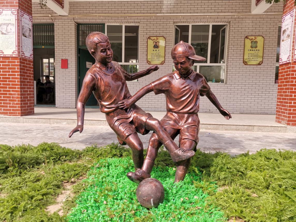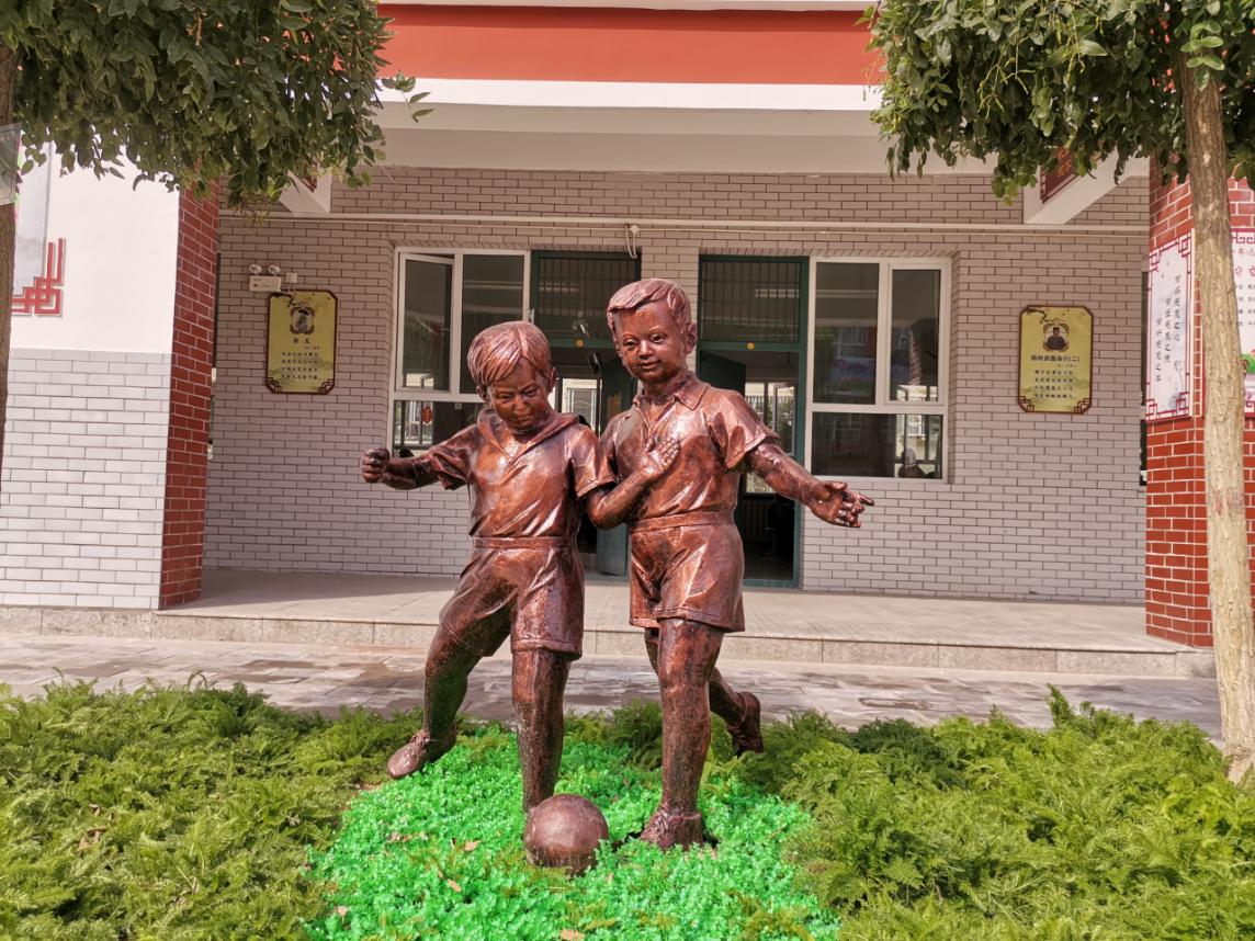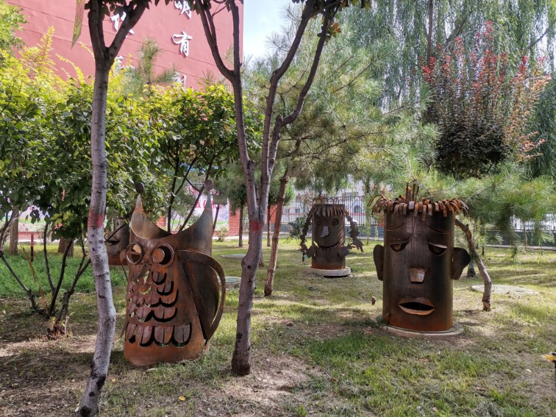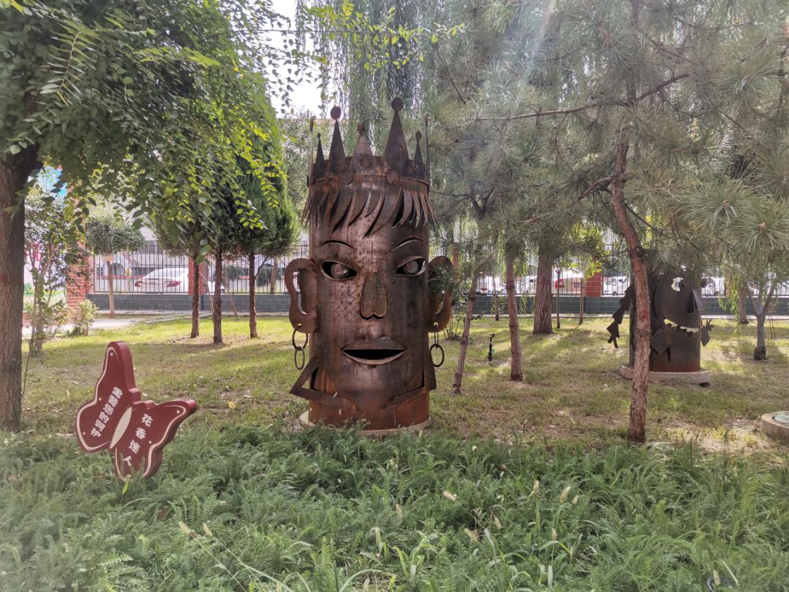 “小题大做”铁艺人物是同学们的纸艺作品,我们把它们放大后搬到校园的绿地里面,突出了学校纸艺文化艺术特色。