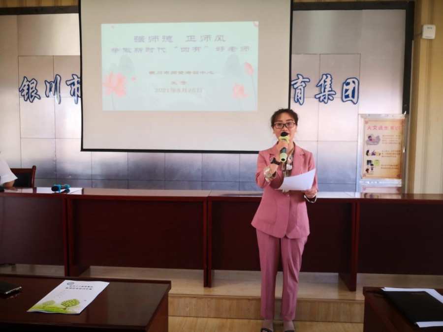 新学期伊始,为了提高金凤十小教育集团全体教师的师德师风及思想觉悟,提升教师队伍的政治站位和综合素养,为新学期营造风清气正的良好氛围,8月26日下午,金凤十小教育集团特邀请银川市师资培训中心的王芳老师莅临集团总校,为集团内全体教师做了主题为“强师德 铸师魂,争做新时代‘四有’好老师”专题培训。