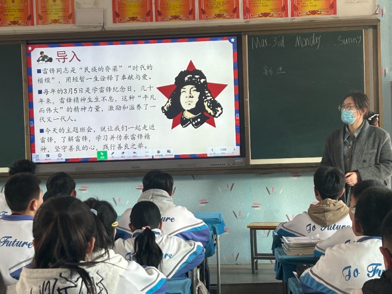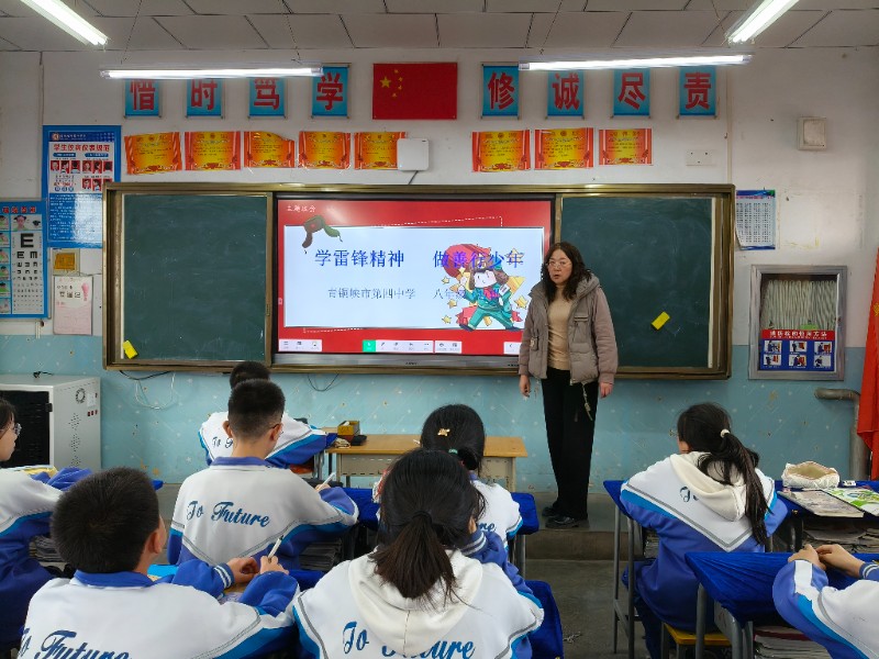 3月3日,青铜峡市第四中学利用升旗仪式,工会主席刘宏军作“执雷锋精神之笔 绘就青春奋进长卷”,向全体学生宣传雷锋故事,发扬雷锋精神,做好“每日一善”活动;下午班会课,各班利用电子白板,继续学习雷锋故事,学习雷锋精神。