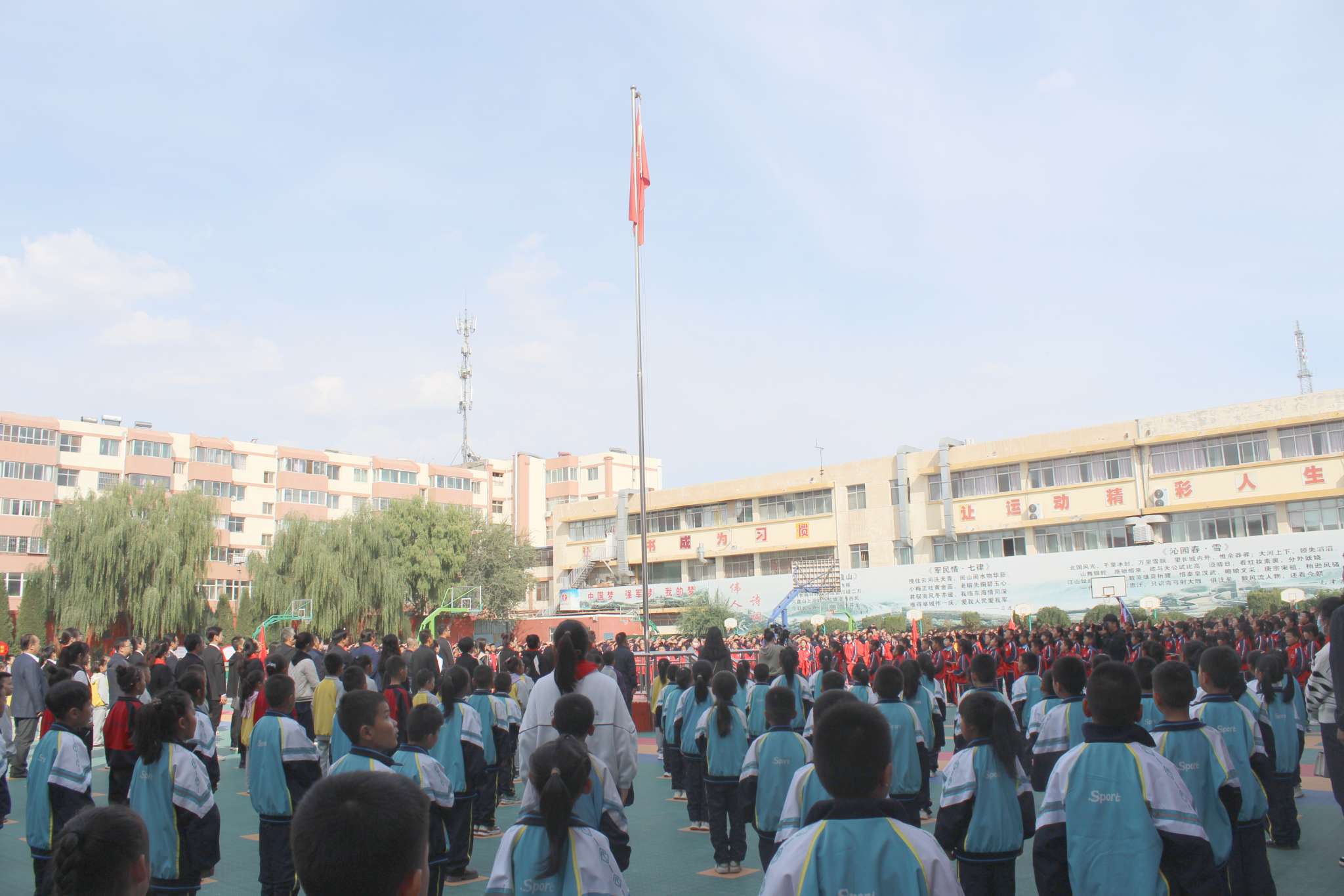 伴随着嘹亮的《义勇军进行曲》,全体师生共同注视着鲜艳的国旗,在这一刻,我们的心中只有祖国。