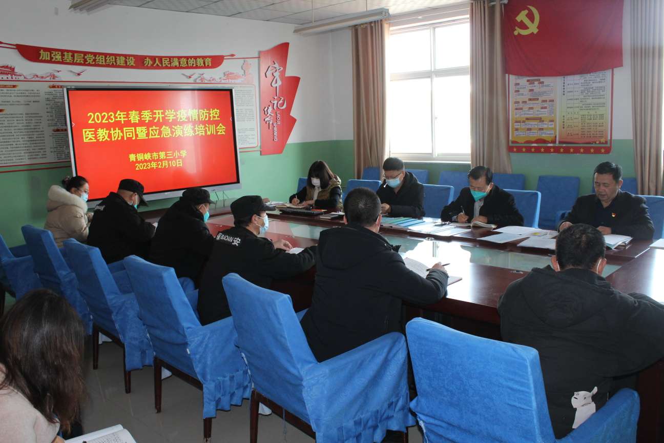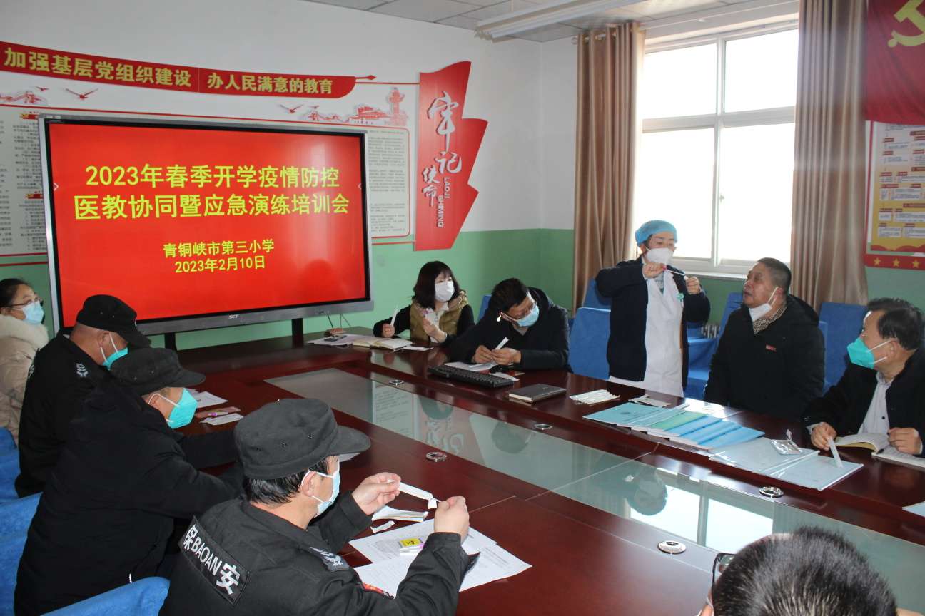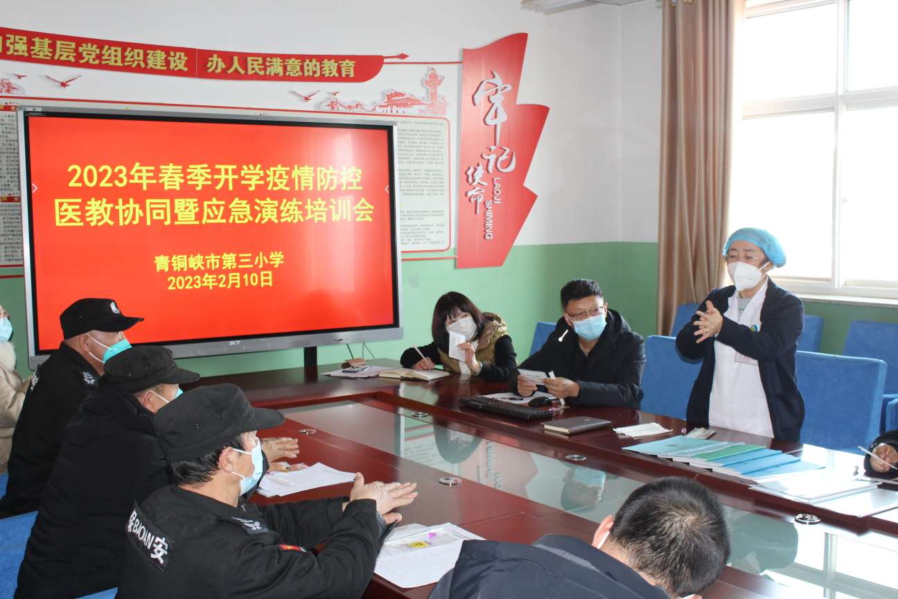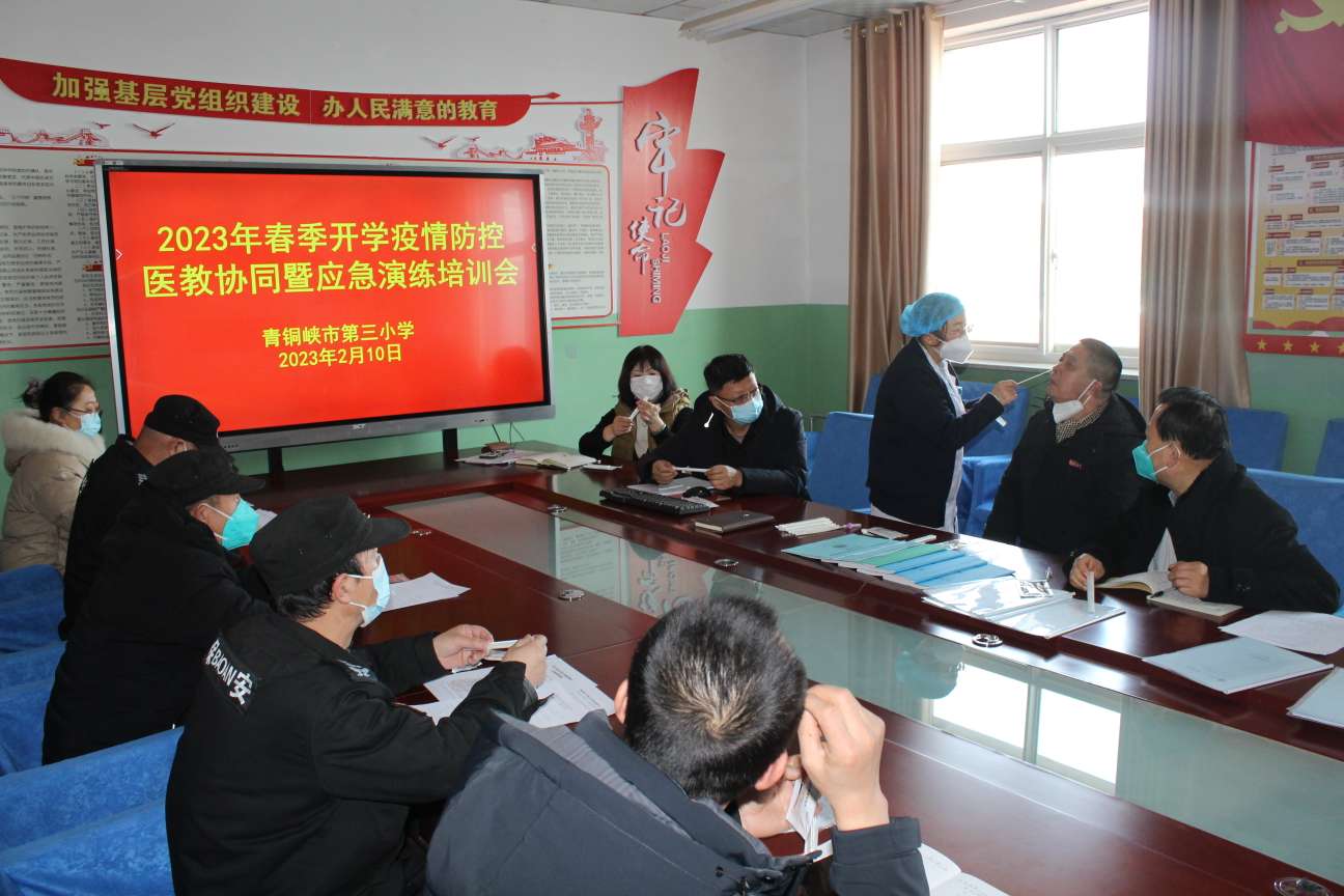 为了认真贯彻落实市教育局《青铜峡市教育系统疫情防控暨校园安全“十严格十严禁”》、《关于做好2023年春季学期教育教学和疫情防控工作的通知》的通知精神,切实做好开学前各项准备工作,进一步提高师生疫情防控和应急处置能力,2023年2月10日,市三小召开“2023年春季开学医教协同疫情防控暨应急演练工作培训会”。