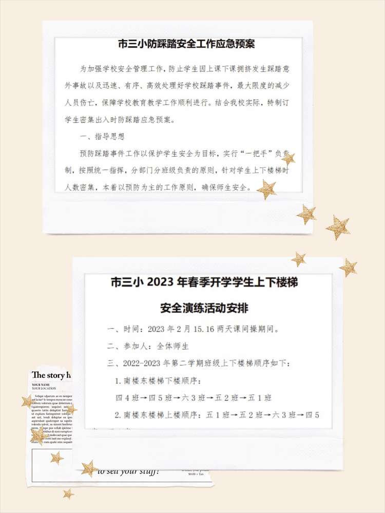 为了进一步增强全校师生的安全防范意识,避免因突发事件造成踩踏事故的发生,切实保障师生的人身安全工作,2023年2月15日,市三小进行“上下楼梯 安全共行”上下楼梯防踩踏安全演练活动。