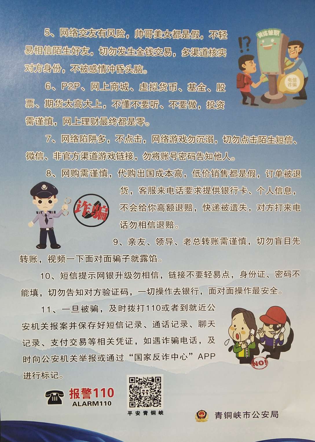 您好!近期电信网络诈骗、犯罪活动猖獗,犯罪分子频繁利用电话、短信和网络实施电信诈骗、犯罪,严重危害社会治安,给群众财产造成了重大损失。为了您的财产安全,请您认真阅读下面的告知书并将基本内容转告您的家人以及亲友、邻居,以增强防范电信诈骗的意识,形成坚实的社会防范基础,有效遏制犯罪。