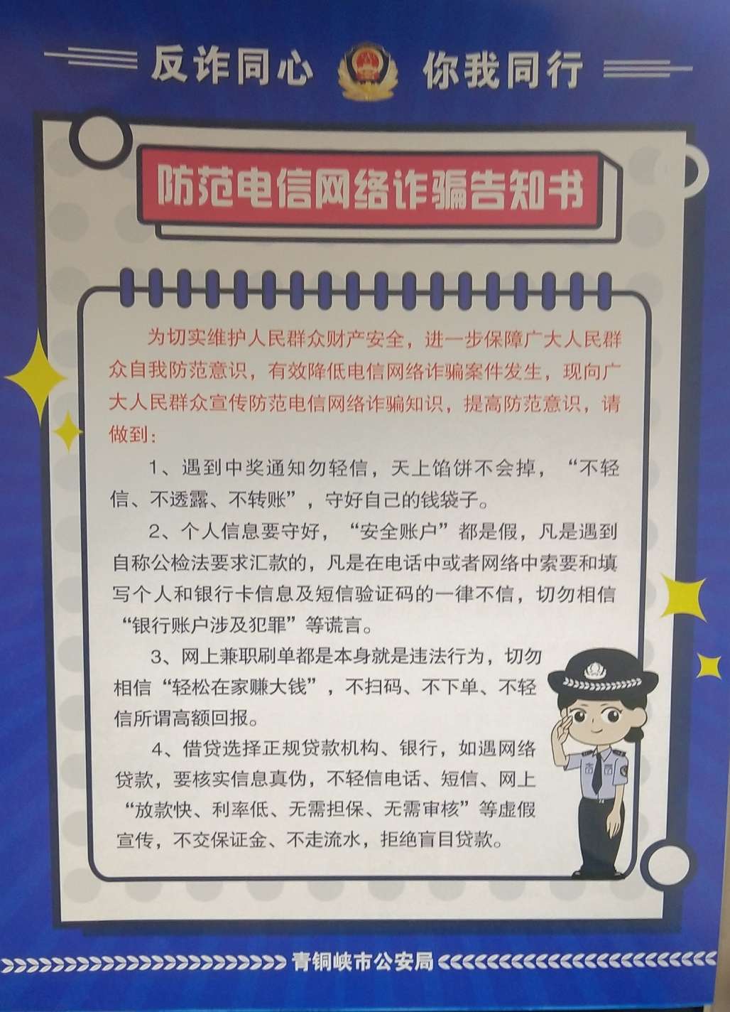 我们希望通过这份告知书,能够赢得广大师生家长的支持,积极配合公安部门和学校开展好安全防范宣传,把学习到的安全防范知识多向家里或邻里的老人宣传,拓展社会宣传的覆盖面,让虚假信息诈骗无机可乘,大幅降低此类案件的发生。