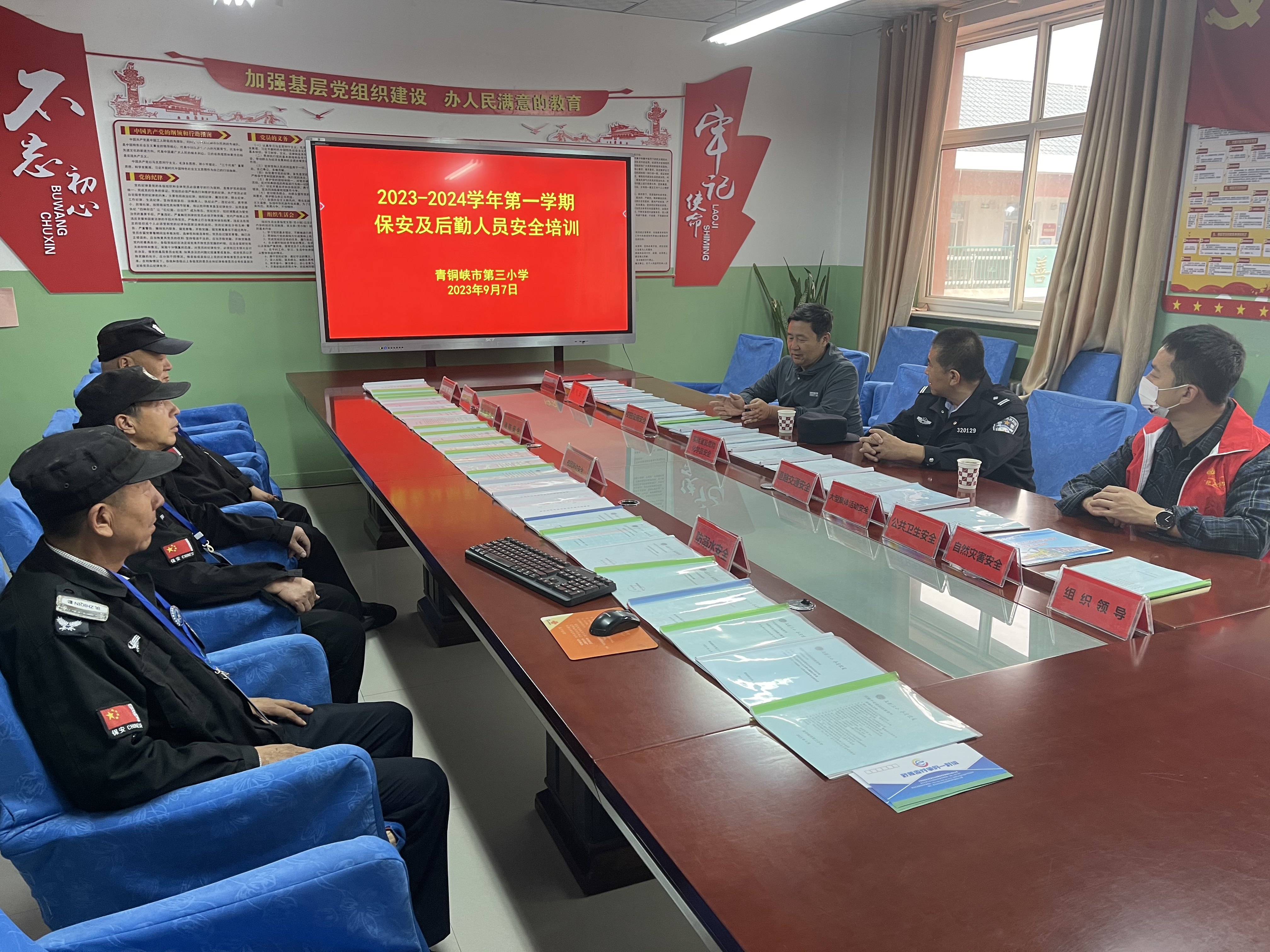 为进一步增强保安人员的安全意识,做好安全保卫工作,提升校园安保人员职业素养和防范应急处置能力,9月7日,市三小邀请辖区民警沙睿到学校对保安人员进行了培训。