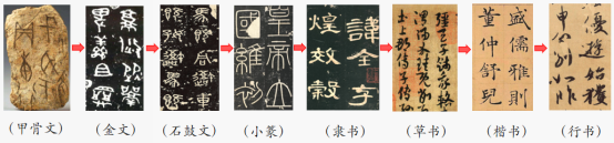 2.汉字的演变。通过字体演变进一步梳理汉字不同时期的表现特征,为学生进一步研究书法做好铺垫。