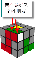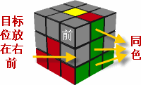 接下来,把这个棱色块的目标位置(在这里也就是红色和绿色中心块夹的这个位置,如上图黄色箭头所指)放在最靠近你的右前角, 这时,同色的一排在前面就是第一种情况,在右面就是第二种情况。