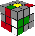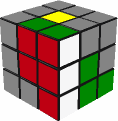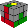 首先,你要先做在顶层上的那些,可能不听话的棱色块会自己被换到顶层上,如果最后他还是不听话,如左图,我们就用上面第一或第二种情况的公式把一个在本步无关大局的含有黄色的棱色块变到该位置,我们要的那个红绿棱色块就自然换到顶层 ,然后你就会做了,请看下面的公式。
