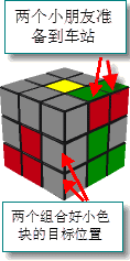 下面四步,"接孩子放学":顶层两个组合好的小色块(两个小朋友),先准备到车站。 对照上一步的图,你可以看出,这个车站是在目标位置的另一侧。