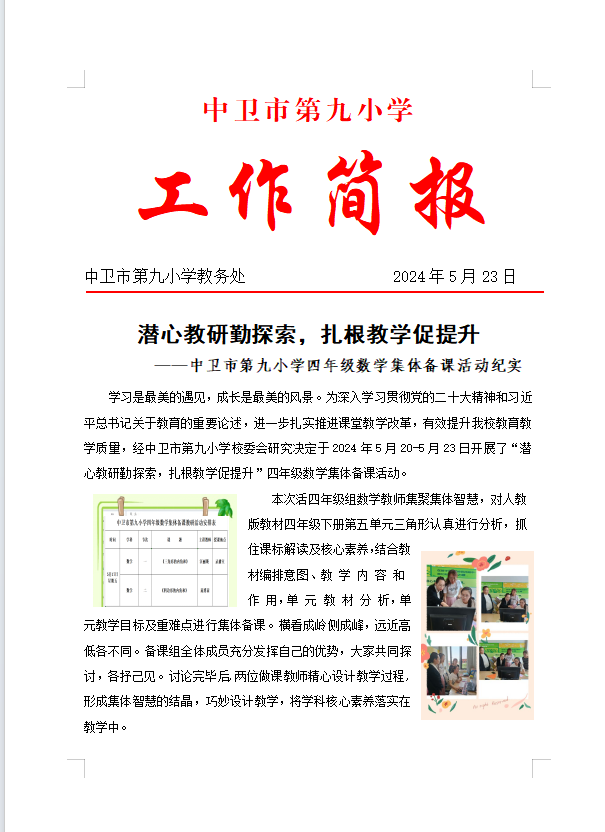 发布时间:2024-05-23 15:40 栏目:学校资讯 发布单位:中卫市第九小学 点击量:1251 【公开】