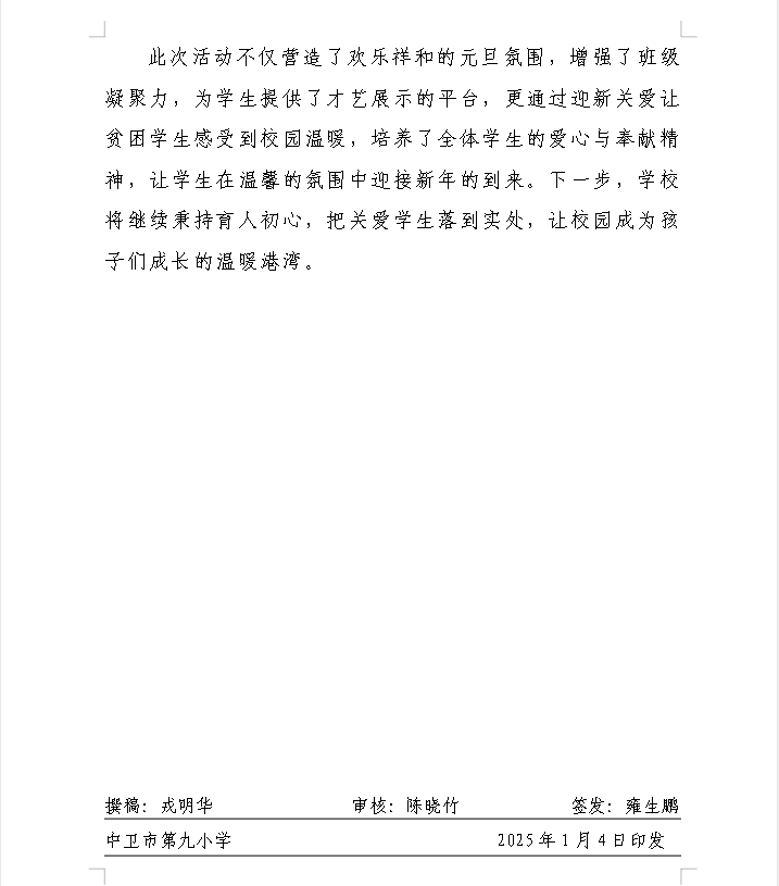发布时间:2026-01-04 08:27 栏目:学校资讯 发布单位:中卫市第九小学 点击量:338 【公开】