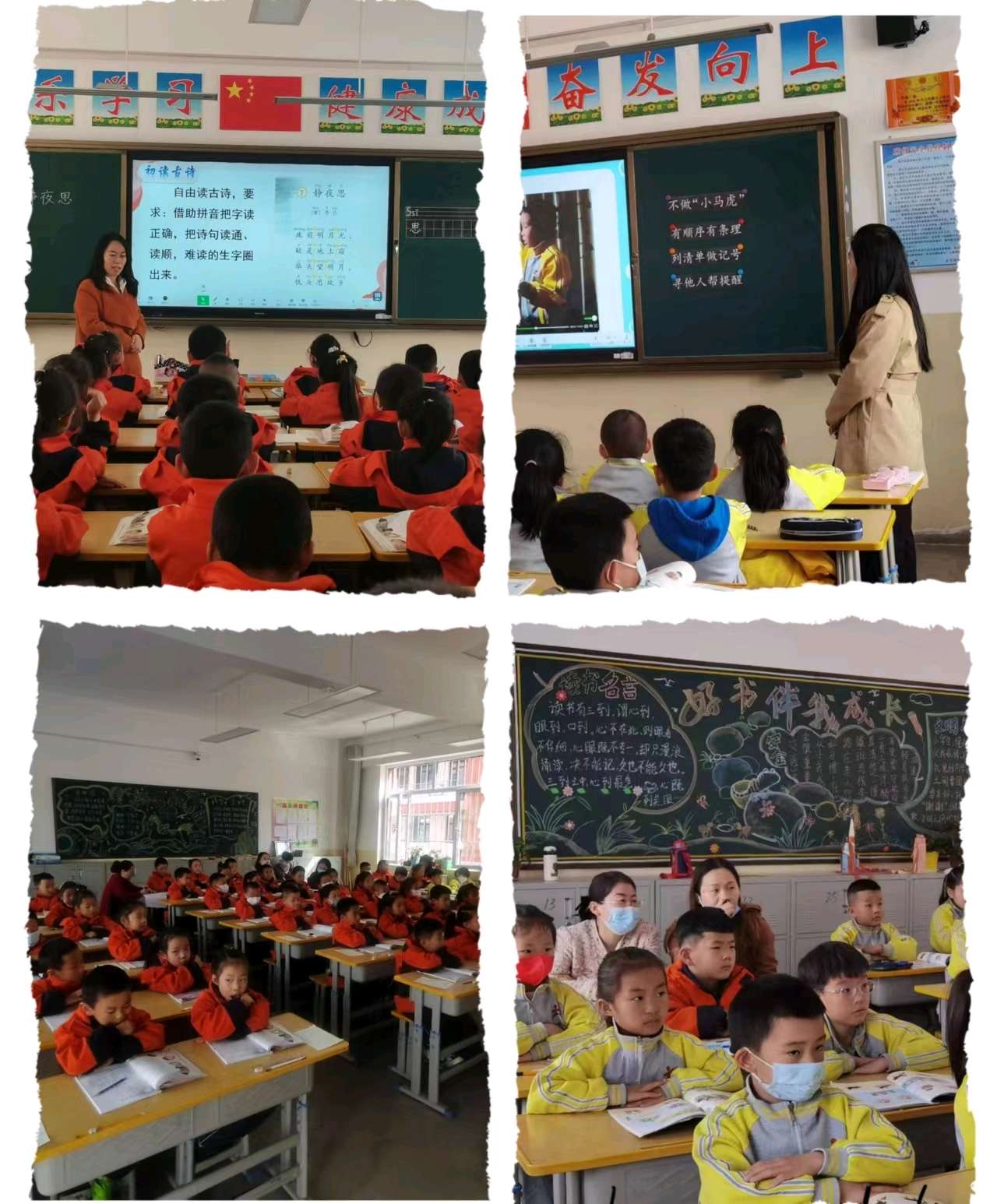 本月的组内课由张晓荣老师和杨克玲老师承担。张晓荣老师执教的《静夜思》一课,赢得了大家的一致好评,让大家受益匪浅。教学中,运用多媒体课件和一些现代信息技术手段,精美的界面设计、古朴典雅的音乐,化静为动,变无声为有声,营造出浓郁的中国古代文化氛围,烘托出良好的教学气氛。这样有助于学生较为迅速、深刻地整体感知诗文,体会作者蕴含在诗中的思想感情。通过多媒体的介入,让诗中的形、声、色、情、意直接作用于学生的感觉器官,更有利于将学生带入诗中所描绘的艺术境界去感受美、领悟美,相信古诗教学的效果会大大提高。杨克玲老师执教的道德与法治《不做“小马虎”》,通过音视频等引导学生认识到马虎的危害,并与孩子们共同探讨,如何克服马虎,他们积极参与其中,产生心灵的碰撞,相信通过本节课教学,孩子们一定能克服马虎,做一个细心的孩子。