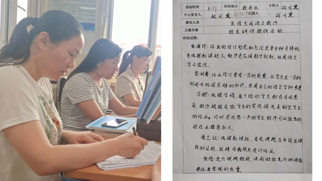 为深入贯彻落实新课标,促进老师们理解新课程标准理念,准确把握和领会新课标的内容和变化,切实把新课标的教育理念和基本要求落实到教学中,开学第二周,中卫六小五年级组全体语文教师在鲁海蓉主任的带领下,分析了学生作业现状,找出了学生作业中存在的共性问题,并集思广益,制定出合理的作业设计方案。