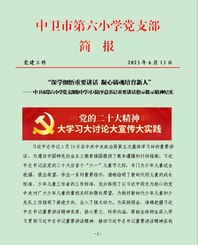 发布时间:2023-06-20 11:13 分类:党建动态 发布单位:中卫市第六小学 点击量:2406 【公开】