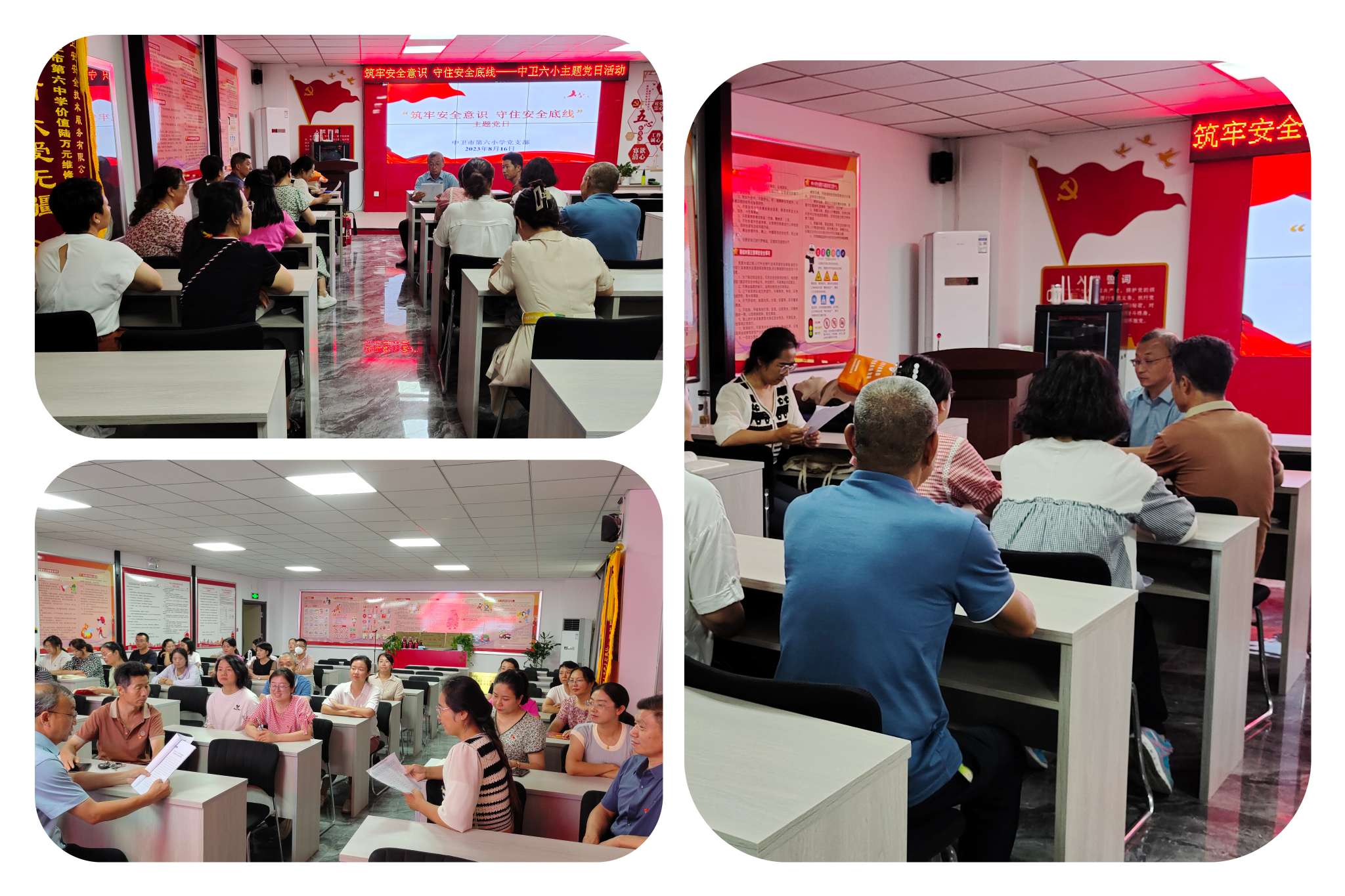 为进一步推动学习宣传贯彻习近平总书记关于安全生产重要论述和重要指示精神、中国共产党宁夏回族自治区第十三届委员会第四次全体会议公报精神走深走实,中共中卫市第六小学支部委员会安全党小组在8月16日组织开展 “筑牢安全意识 守住安全底线”主题党日活动,结合工作实际,党小组成员深入开展集中学习和交流研讨,推动习近平总书记关于安全生产重要论述和重要指示精神、中国共产党宁夏回族自治区第十三届委员会第四次全体会议公报精神落实在教育工作的各方面和全过程。