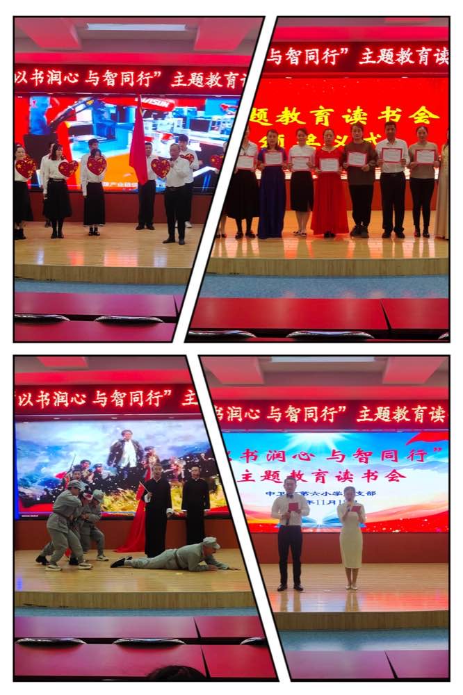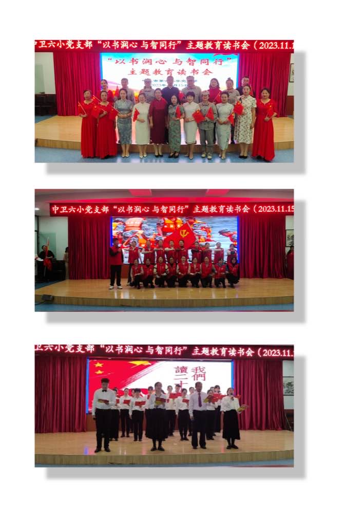 为深入开展学习贯彻习近平新时代中国特色社会主义思想主题教育,全面贯彻党的二十大精神,在全校营造读书好、好读书、读好书的良好氛围,引导全体教师以阅立德,以阅促知,以阅促行,推动全体党员和教职工真学真懂真信真用,筑牢信仰之基、补足精神之钙、把稳思想之舵。按照《中卫市教育局关于印发<第五期"读 思 享 阅 知 行"青年干部人才读书会方案>的通知》,中卫六小党支部于2023年11月15日组织开展了"以书润心 与智同行"主题教育读书会活动,为全体教师带来了一场思想洗礼。
