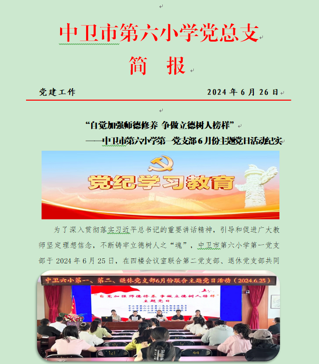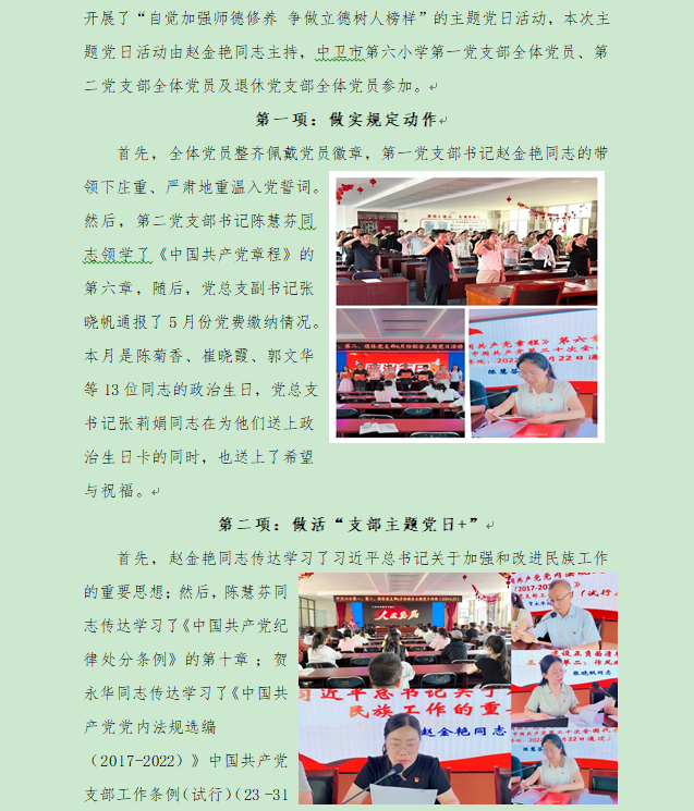 “自觉加强师德修养 争做立德树人榜样”中卫市第六小学第一党支部6月份主题党日活动纪实