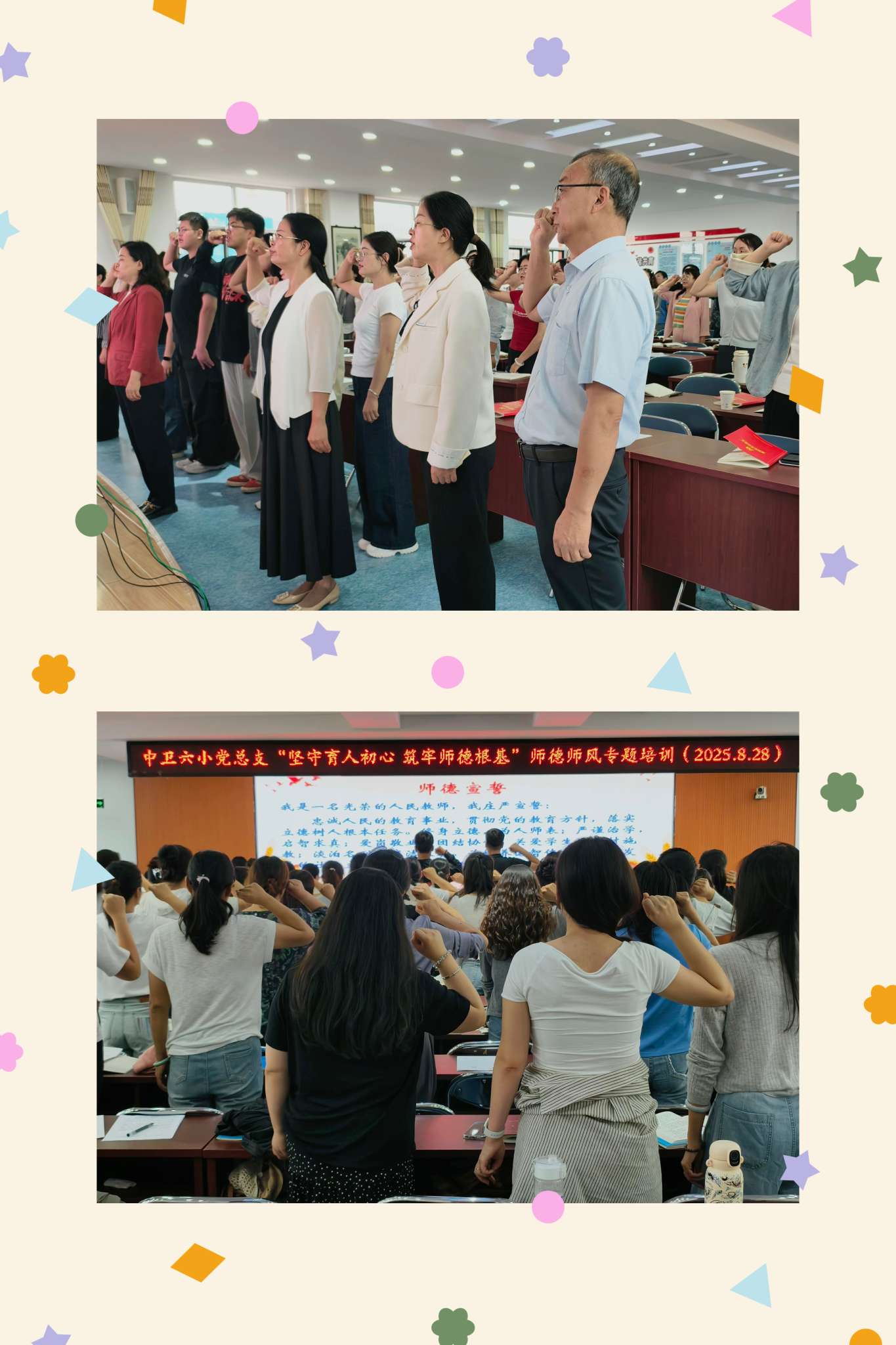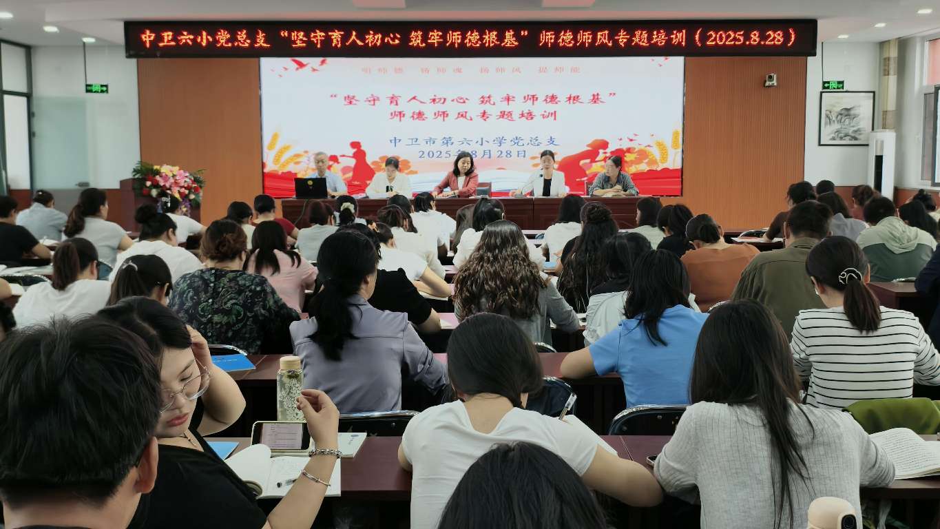 为进一步加强教师队伍建设,弘扬高尚师德师风,2025年8月28日早上,中卫市第六小学党总支组织全体教师开展了以“坚守育人初心,筑牢师德根基”为主题的师德师风专题培训活动。