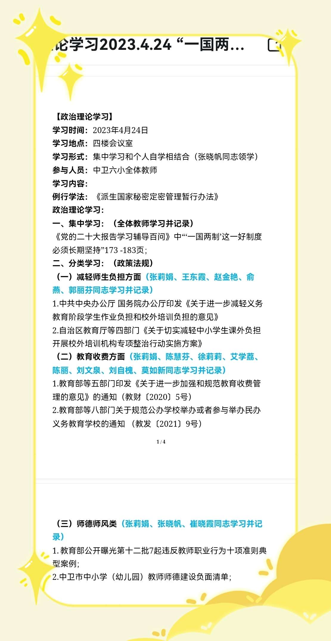 然后继续结合各位领导所分管的工作进行了分类学习,组织张莉娟、王东霞、赵金艳、俞燕、郭丽芬5位同志学习并记录了减轻师生负担方面的法规,有《中共中央办公厅 国务院办公厅印发<关于进一步减轻义务教育阶段学生作业负担和校外培训负担的意见> 》《自治区教育厅等四部门<关于切实减轻中小学生课外负担 开展校外培训机构专项整治行动实施方案>》,进一步落实好“双减”工作,促进学校的教育教学工作更上一层楼。