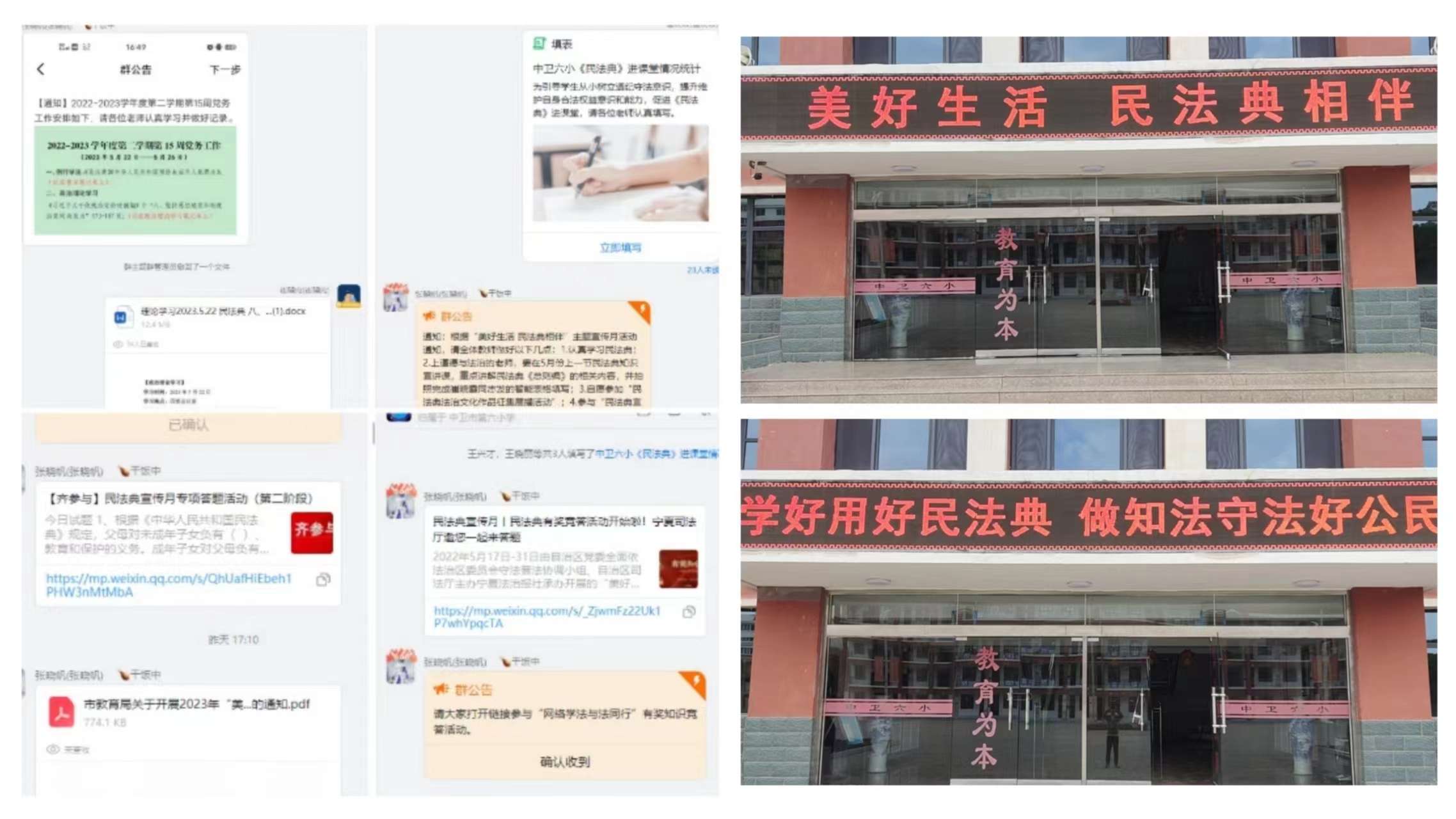 为深入学习贯彻习近平法治思想,推动全市教育系统不断增强尊法学法守法用法的意识,让民法典走到师生身边、走进师生心里,根据区、市2023年“美好生活•民法典相伴”主题宣传月活动的相关部署,结合工作实际,制订了我校《“美好生活•民法典相伴”活动方案》,并依据方案开展了一系列学习宣传活动,现总结如下:
