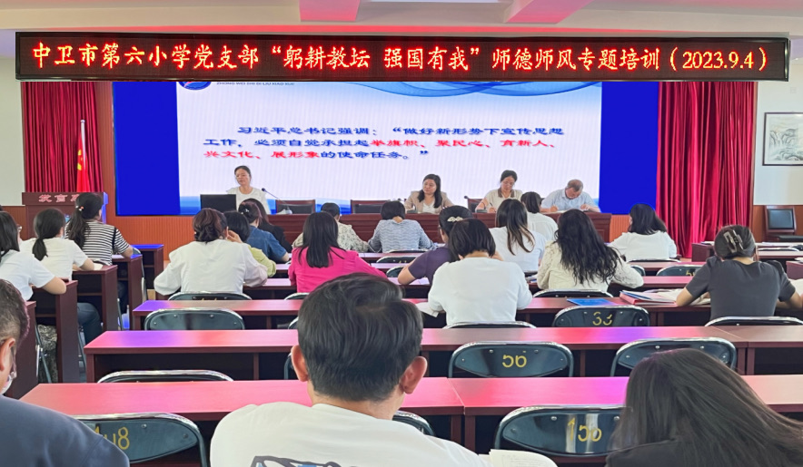 为热烈迎接第39个教师节,引导全体教师深入学习贯彻党的二十大精神和习近平总书记关于教育工作的重要论述,集中展示广大教师和教育工作者爱党爱国、立德树人、敬业奉献、自信自强的良好风貌,9月4日下午,中卫市第六小学党支部组织全体教师通过开展“躬耕教坛 强国有我”师德师风专题培训,再抓全体教师师德师风建设,共同努力为中卫六小打造一支高素质专业化创新型教师队伍。本次培训由张莉娟同志主持。