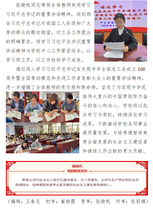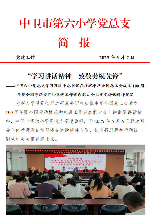 ——中卫六小党总支学习习近平总书记在庆祝中华全国总工会成立100周年暨全国劳动模范和先进工作者表彰大会上重要讲话精神纪实