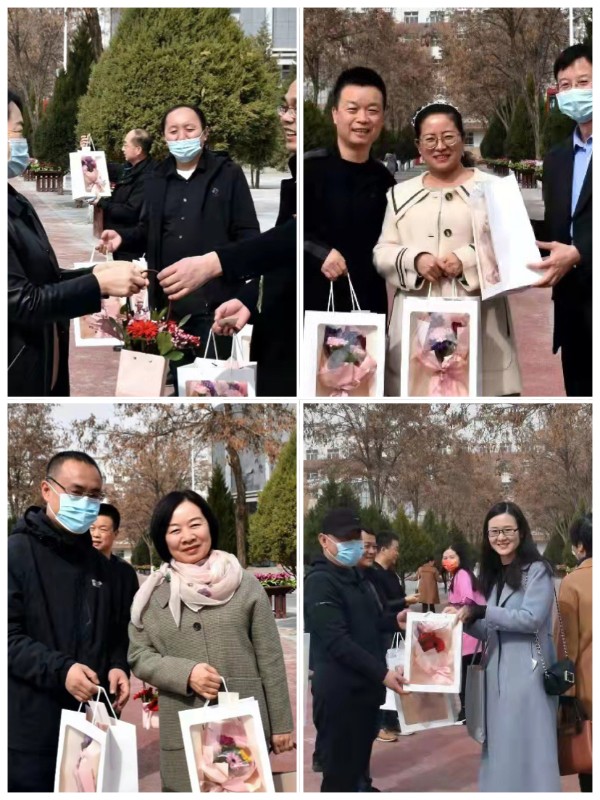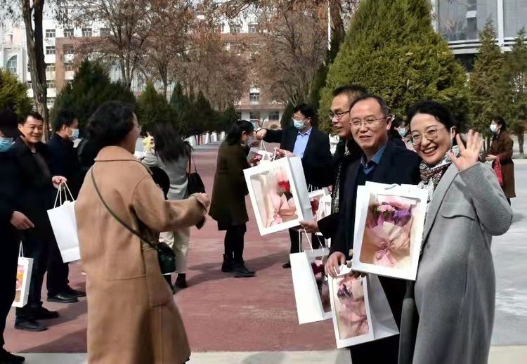 下午十四时开始,女教师们陆续走进吴忠中学的校园,迎接他们的是一个更大的惊喜!校领导和男教师们,早已列好队,手捧鲜花,迎接着女教师们的到来。男教师们神采飞扬,将祝福都融化在了笑容里,藏在了鲜花里。