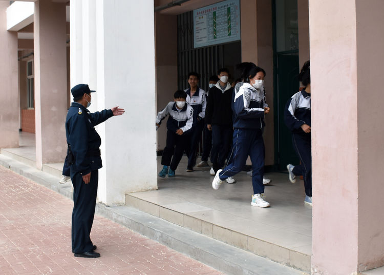 学校领导参加了整个演练过程,同学迅速跑步到达指定地点,原地抱头蹲下,保持安静;以班级为单位集队,清点人数,并向年级主管副校长报告。