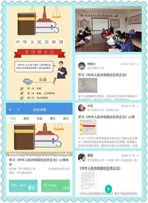 为了让法制进校园,进一步增强老师,学生以及家长的法律意识,学会利用法律进行自我保护,做一个知法、守法的合格公民,为学习和宣传《中华人民共和国社区矫正法》,营造良好的学习环境,贺兰五小开展了《中华人民共和国社区矫正法》学习活动。