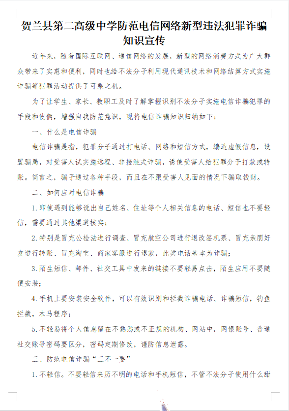 贺兰县第二高级中学预防电信诈骗知识宣传图