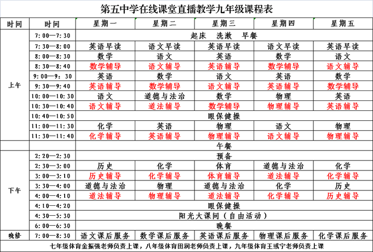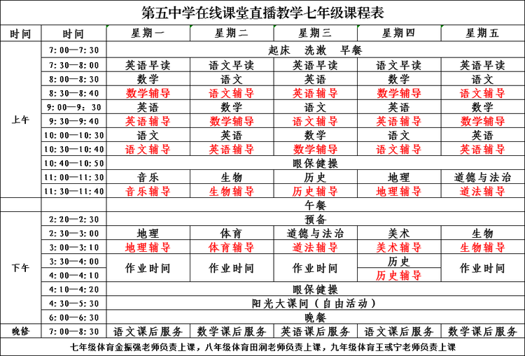 2.学习:根据相应年级相应学科教学课表认真完成线上学习任务;线上上课时,准备好课本、笔、笔记本等文具;