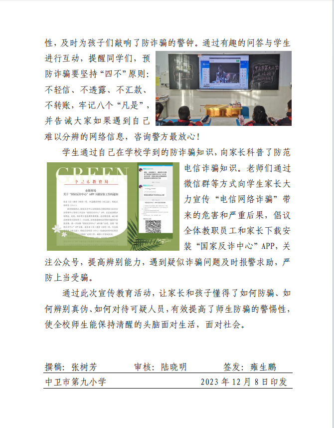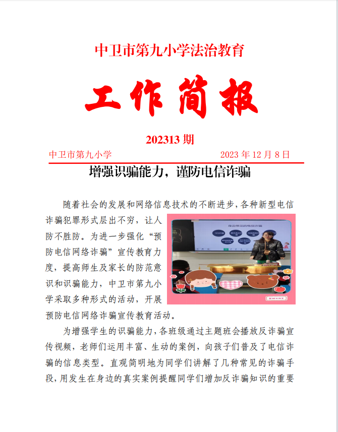 发布时间:2023-12-08 16:30 栏目:安全教育 发布单位:中卫九小 点击量:3077 【公开】