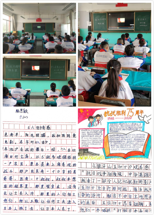 2020年是中国人民抗日战争暨世界反法西斯战争胜利75周年。贺兰县第五小学以“铭记历史 奋勇前进”为主题开展了“五个一”爱国主义教育系列活动,即开一次主题班会、看一部爱国影片、唱一首爱国歌曲、写一篇观(读)后感、办一份手抄小报。