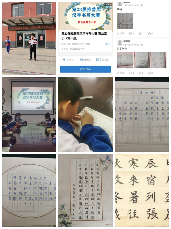 从9月11日开始,我校举办一系列推广普通话活动,活动内容包括升旗仪式上喇悦老师强调了说好普通话的时代意义;组织班队会学习了说好普通话的重要性和怎么做;利用班级黑板报推普专题宣传、以及校园内挂出多条推普标语横幅等;利用“互联网+德育”在云校家平台征集书法作品。在9月22日,德育处和教导处组织了第一届贺兰五小书写大赛,大赛在五六年级32位入选作品中决出一二三等奖。