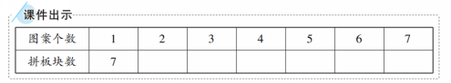 【学情预设】学生很容易发现,拼一个图案需要7块拼板,然后利用每次加7的方法,可以很快在表格中填出14、21、28、35、42、49。