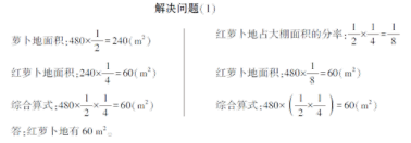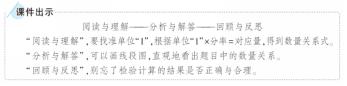 一、创设情境,导入新课 1.情境导入。 师:同学们,暑假里有没有去乡下走走转转呀?这不,小明暑假去外婆家时就发现了一个数学问题:外婆家养了24只鸡,养的鸭的只数是鸡的只数的 师:根据所给条件,你能求出什么? 2.揭示课题。 师:同学们通过含有分率的句子知道了单位“1”、分率与具体量之间的对应关系。本节课我们就继续探究稍复杂的分数应用问题。[板书课题:解决问题(1)] 二、自主探究,思辨交流 1.阅读与理解。 (1)课件出示教科书P12例8。 (2)学生自主阅读题目,并和同桌说说从中获取了哪些数学信息。 (3)学生独立完成教科书P12例8“阅读与理解”中的填空。 (4)全班汇报,教师引导学生再次理解题意。 2.分析与解答。 (1)师:请你画图表示题中的已知条件和问题,并尝试列式计算,最后用自己喜欢的方法检验一下答案是否正确,可以与小组同学交流。 (2)汇报交流。 师:谁愿意向大家汇报自己的解题思路? 3.回顾与反思。 师:刚才我们用两种不同的方法求出了红萝卜地的面积是60m2,现在我们能写答句了吗?(不能。因为我们还没有对这个答案进行检验。)你能用自己喜欢的方法检验一下吗? (1)学生尝试检验。 (2)全班交流。只要学生的检验方法合理,教师都要予以肯定。 三、巩固练习,综合应用 1.课件展示教科书P13“做一做”。 (1)学生用自己喜欢的方法解答,并检验答案是否正确。教师巡视,对学习有困难的学生进行个别辅导。 (2)交流汇报,指名按照阅读与理解、分析与解答、回顾与反思三个环节展开交流。 2.课件展示教科书P15“练习三”第1~3题。 (1)指名三名学生板演,其余学生独立分析、解答,教师巡视指导。 (2)集体订正时,指名说一说题中的数量关系。对理解有困难的学生可以用线段图帮助其理解。 (3)同桌交换检查,发现问题及时纠正。 (4)引导学生比较3道题的异同,总结“连续求一个数的几分之几是多少”的实际问题的特征,明确关键是先找准动态变化的单位“1”,再用乘法计算。 四、课堂小结,拓展延伸 师:同学们通过画图、分析含有分率的句子,找准单位“1”的量,明确了分率与具体量的对应关系,这样的方法是我们解决分数问题的好方法。 |