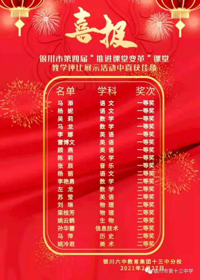 银川六中教育集团十三中分校取得优异成绩,9名老师获得一等奖,10名老师获得二等奖。