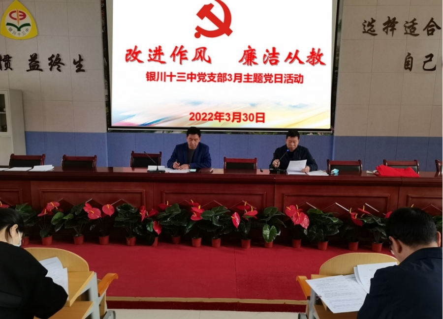 为坚定不移推进全面从严治党,强化党员廉洁从教意识,增强党员廉洁从教、廉洁用权、廉洁修身、廉洁齐家的思想自觉,根据自治区党委要求和银川市第十五次党代会、市纪委十五届二次全会部署,2022年3月30日,银川十三中党支部召开3月主题党日活动。全体党员、入党积极分子参加。