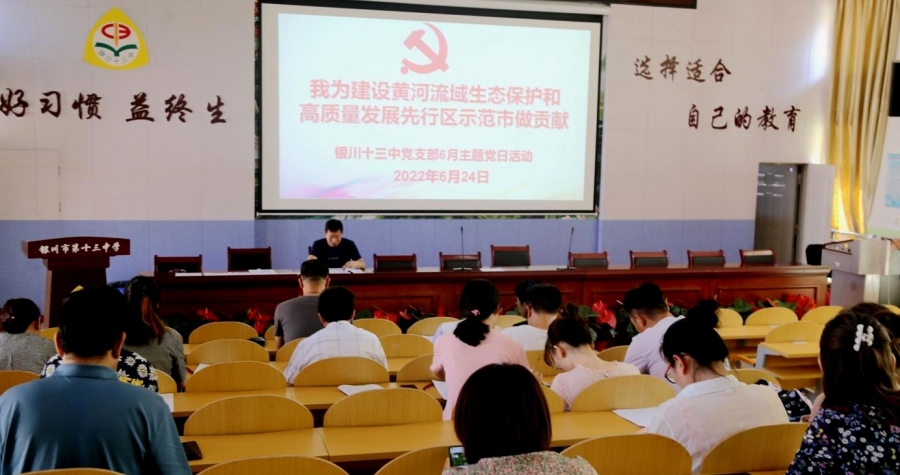 为加快建设黄河流域生态保护和高质量发展先行区的首府核心区,以优异成绩迎接党的二十大和自治区第十三次党代会胜利召开,2022年6月24日上午,银川十三中党支部开展“我为建设黄河流域生态保护和高质量发展先行区示范市做贡献”6月主题党日暨支部书记讲党课活动,全体党员和入党积极分子参加。