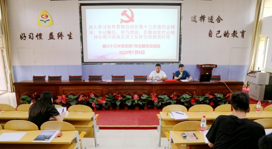 为学习好、宣传好、贯彻好自治区第十三次党代会精神,进一步发挥广大党员先锋模范作用,确保党代会精神落地见效,2022年7月9日下午,银川十三中党支部开展7月份主题党日活动,活动的主题是“深入学习宣传贯彻自治区第十三次党代会精神,牢记嘱托、担当使命,在推动党代会精神在银川落地见效上发挥先锋模范作用”。