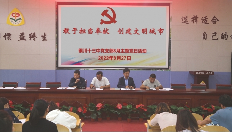 为进一步发挥基层党组织的战斗堡垒和党员先锋模范作用,全面展现广大党员在文明城市创建中的良好形象,引导辖区群众居民共同投入到文明城市创建中来,银川十三中党支部组织全体党员和入党积极分子开展8月份主题党日系列活动。