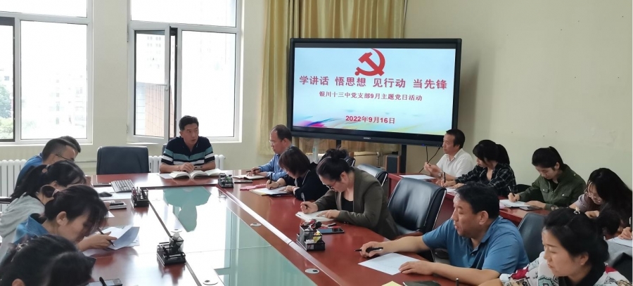 为深入推进习近平总书记视察宁夏重要讲话和重要指示批示精神“大学习、大讨论、大宣传、大实践”活动纵深发展、取得实效,9月16日,银川市第十三中学党支部召开“学讲话、悟思想、见行动、当先锋”9月主题党日暨讲党课活动。