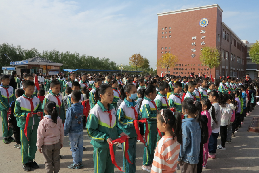 激昂的少先队队歌过后,学生为六位新聘请的中队辅导员老师佩戴鲜红的红领巾,校长为六个新中队授中队旗。