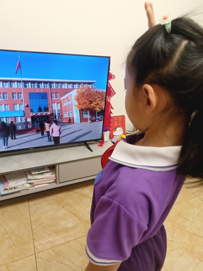 伴随着嘹亮的国歌,五星红旗冉冉升起。少先队员佩戴红领巾,在家中面向线上国旗肃立,唱国歌,行队礼。