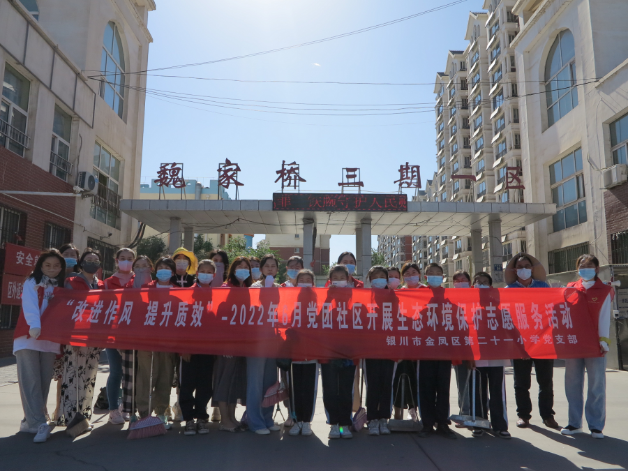 为扎实开展党史学习教育,把学党史悟思想成效转变成为群众解难题,办实事的实际行动,增强党员教师和团员教师的责任意识。6月13日,金凤区第二十一小学党支部联合团委、少先队开展了以“改进作风,提升质效”社区生态环境保护志愿服务活动。