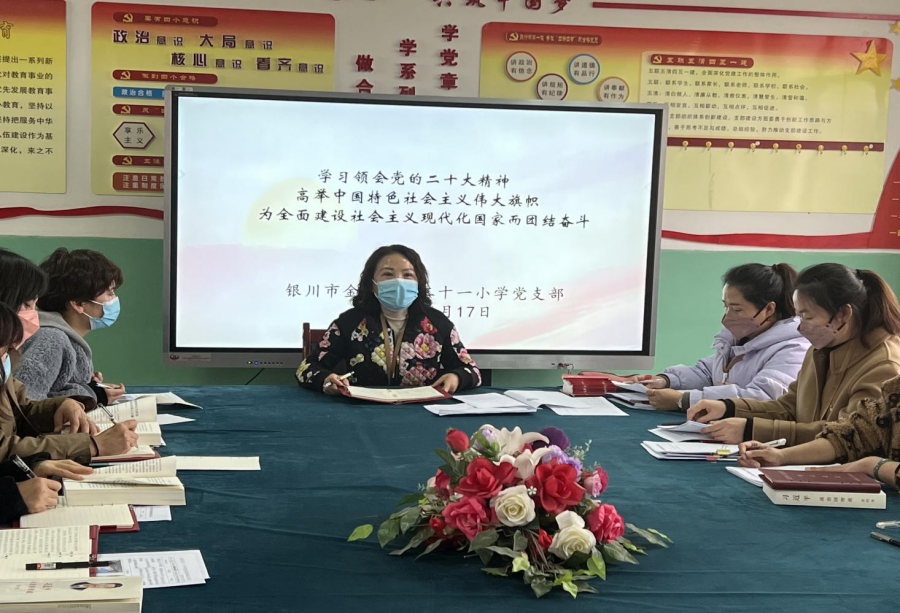 最后,党支部书记李丽芳同志总结到:党的二十大是在我国迈上全面建设社会主义现代化国家新征程、向第二个百年奋斗目标进军的关键时刻召开的一次十分重要的大会,举国关注、世界瞩目。各位党员要努力进行全面系统学、深入思考学、联系实际学,不断提高政治能力,全面掌握党的二十大精神精髓,做到内化于心、外化于行,切实把学习成效转化为应对风险挑战、推动事业发展的治理能力和工作水平。一名党员就是一面旗帜,党员要带头担当作为,带头履职尽责,把各项工作抓紧抓好,为全面建设社会主义现代化美丽新宁夏作出金凤教育人的新贡献。