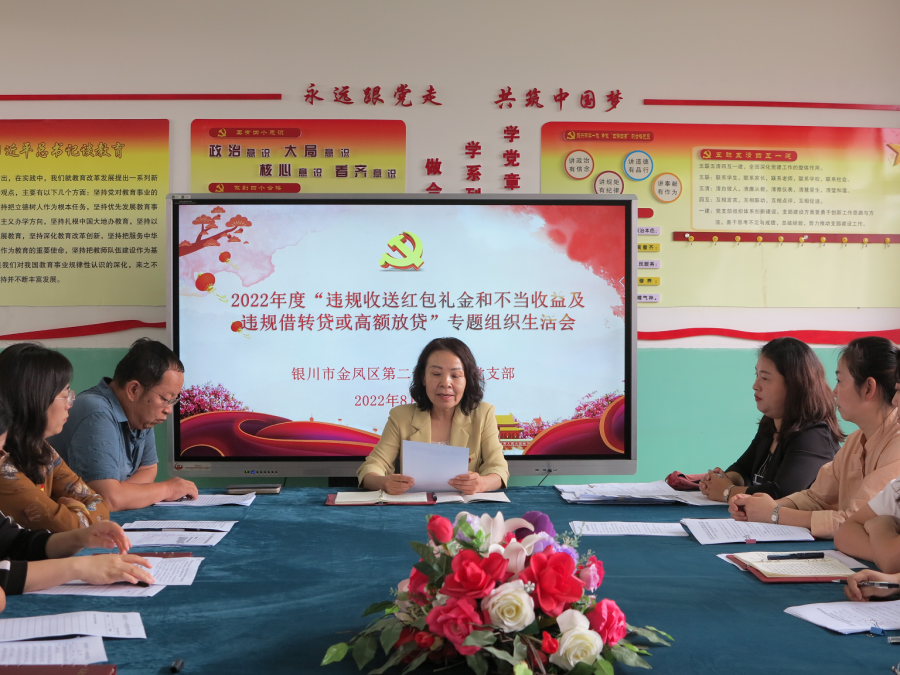 为深入贯彻落实习近平总书记关于全面从严治党重要论述,着力营造风清气正的校园政治生态和干事创业良好环境,推动全面从严治党向纵深发展,按照自治区党委、银川市委和金凤区委部署,根据《关于印发<金凤区开展违规收送红包礼金和不当收益及违规借转贷或高额放贷专项整治工作方案>的通知》(银金党办发〔2022〕56号)和《关于印发<金凤区教育系统开展违规收送红包礼金和不当收益及违规借转贷或高额放贷专项整治工作方案>的通知》(金教党发〔2022〕21 号)要求及中国共产党银川市金凤区教育工作委员会下发的《金凤区教育系统关于召开违规收送红包礼金和不当收益及违规借转贷或高额放贷专题组织生活会的通知》精神,通过集中学习动员、谈心谈话、主动征询意见和检视,经教育党工委安排批准,今天,我们隆重召开金凤区第二十一小学党支部“违规收送红包礼金和不当收益及违规借转贷或高额放贷专项整治工作”专题组织生活会,会议由支部书记李丽芳主持。
